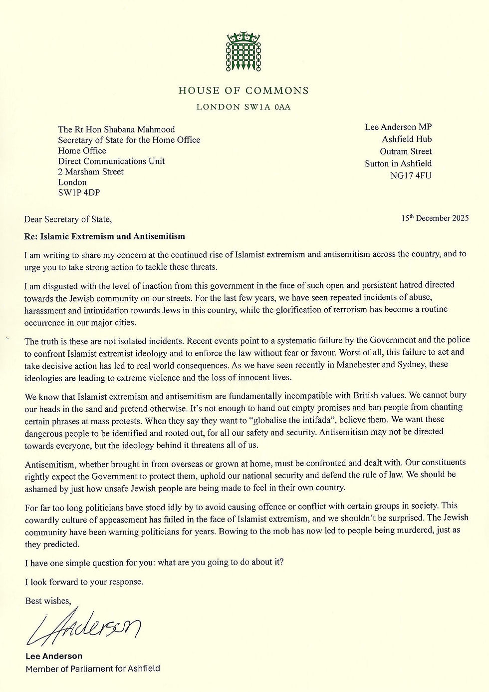 The Reform UK Member of Parliament for Ashfield has written to Home Secretary Shabana Mahmood asking her what she is going to do about islamic extremism and antisemitism in the UK.